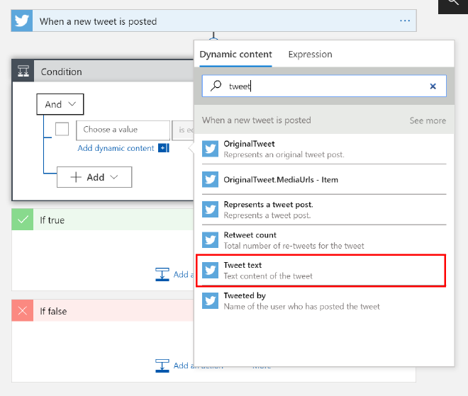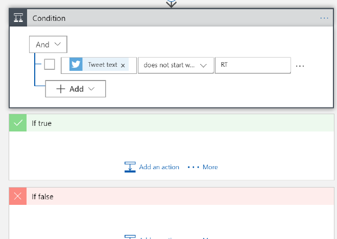 Retweets will start with ‘RT’ so select ‘Tweet text’, ‘does not start with’ and ‘RT’ as values for the condition. Because of this condition the Logic App will split the flow in a If true section which will be hit if the condition is met and an If false section when the condition is not met (obviously).