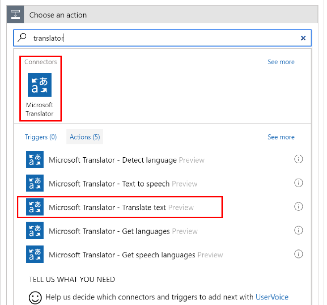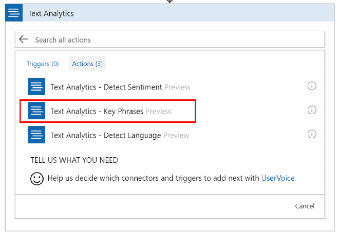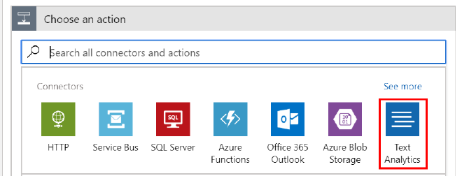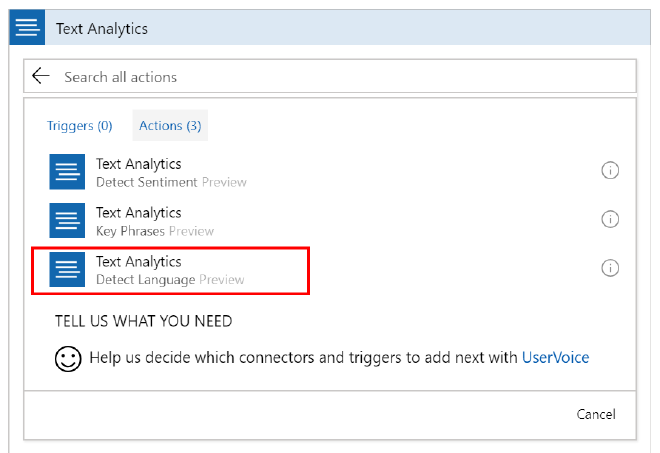 Add an action to the ‘If true’ section and select Text Analytics - Detect Language.