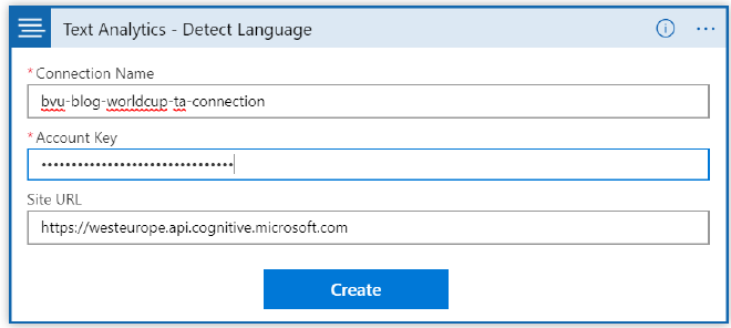 This Cognitive Service will return the detected language and a numeric score between 0 and 1. Scores close to 1 indicate 100% certainty that the identified language is correct. Enter a name for the connection, the key can be found in the Text Analytics resource we created earlier. The URL is the endpoint mentioned in the overview page of the Text Analytics service. Select the tweet text as the text to analyze.