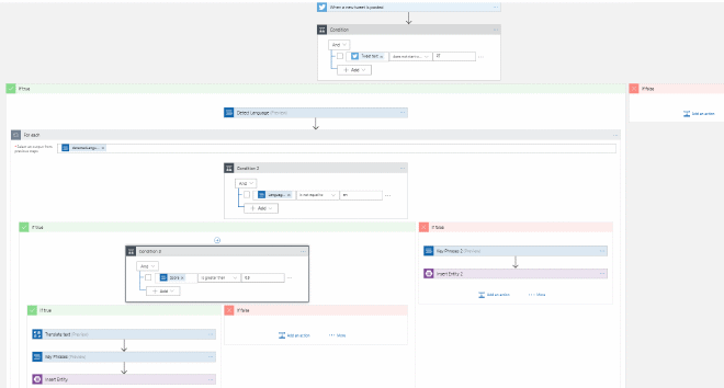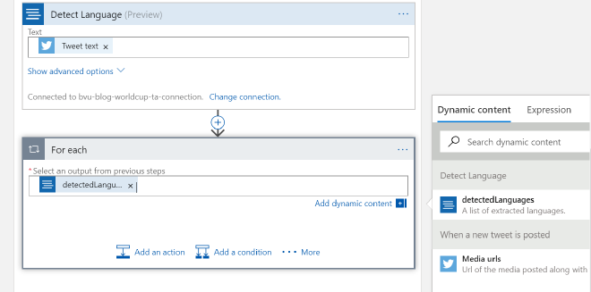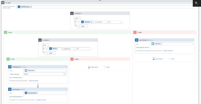 Do the same in the ‘If false’ step after we check if tweet was in English, but this time select the Tweet Text as the text to analyze. At this point the ‘For each’ step in the Logic App should look something like this: