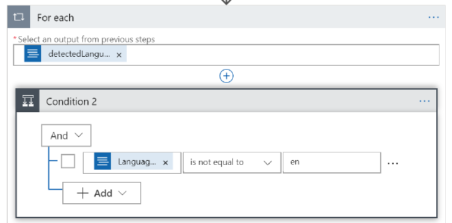We want to prevent unnecessary calls to the Translate Text API so we will add a new condition to the ‘For each’ step and check if the tweet was not in English (Language Code is not equal to ’en’).