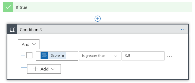 If the tweet is in English we will skip the translation and proceed with the next step which is the detection of key phrases in the tweet. For the non-english languages we only want to proceed and translate the tweet if the Text Analytics service was very confident about the result. We don’t want to waste translations (API calls and money) if it’s not sure it detected the correct language. Add a condition to the ‘If true’ step to require the score from the Text Analytics step to be greater than 0.8. Only when this condition is met we will translate the tweet text to English.