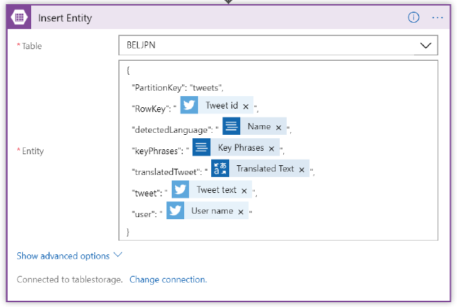The PartionKey and a unique RowKey (f.e. the Tweet Id) are required, all other columns are optional and names can be chosen freely.I stored the detected language, the key phrases (duh), the translated tweet (of course only when the tweet has been translated), the untranslated tweet and the user that sent the tweet. Once again use the Dynamic Content to add values to the properties.