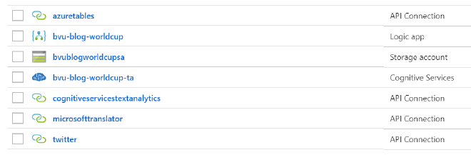 Next to the resources we have created at the start, the Logic App has also added some API connections to the Resource group. These were created when we specified the connections to Twitter, Azure Translate, Azure Text Analytics and Azure Table Storage during the design of the Logic App.