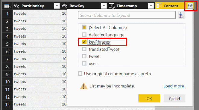 Open Power BI desktop and click on the Get Data button. Select Azure - Azure Table Storage, click connect and enter the name of the Table Storage resource created earlier. Next select the table you used to store the data and hit edit to open the Power Query Editor.Extend the content column to see the columns the Logic App has stored, for now we only need the keyPhrases column. The ‘keyPhrases’ column contains the array of key phrases returned by Azure Text Analytics.
