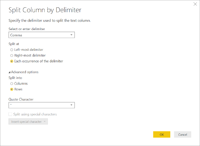 To make it a bit easier to do an analysis on this data we need to save every key phrase in the array as a separate row. Make sure you have the ‘keyPhrases’ column selected, then click Replace Values and remove the opening and closing brackets. Next click Split Column - By Delimiter, use ‘comma’� as delimiter, split at each occurrence of the delimiter, expand the advanced options and select ‘split into rows’. Click Close and Apply to save the query and close the editor.
