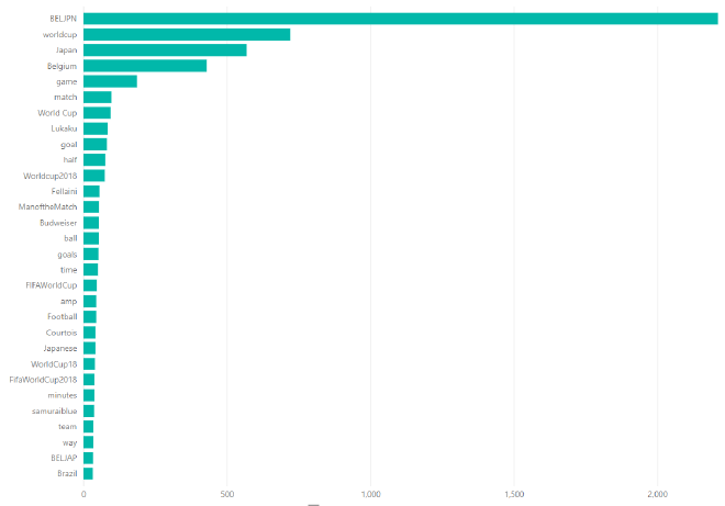 What can we learn from this? Well, to be honest, not much. The most used key phrases are the hashtag of the match, worldcup in different forms (worldcup, World Cup, WorldCup2018), the two countries (Belgium and Japan), ‘match’ and ‘game’. But we can also see some players (Lukaku, Fellaini, Courtois) and ‘goal(s)’ in the list. I guess the game didn’t end in 0-0, but that’s pretty much all we can tell from this. It would be nice if we could extract some more detailed information about the match from our data.