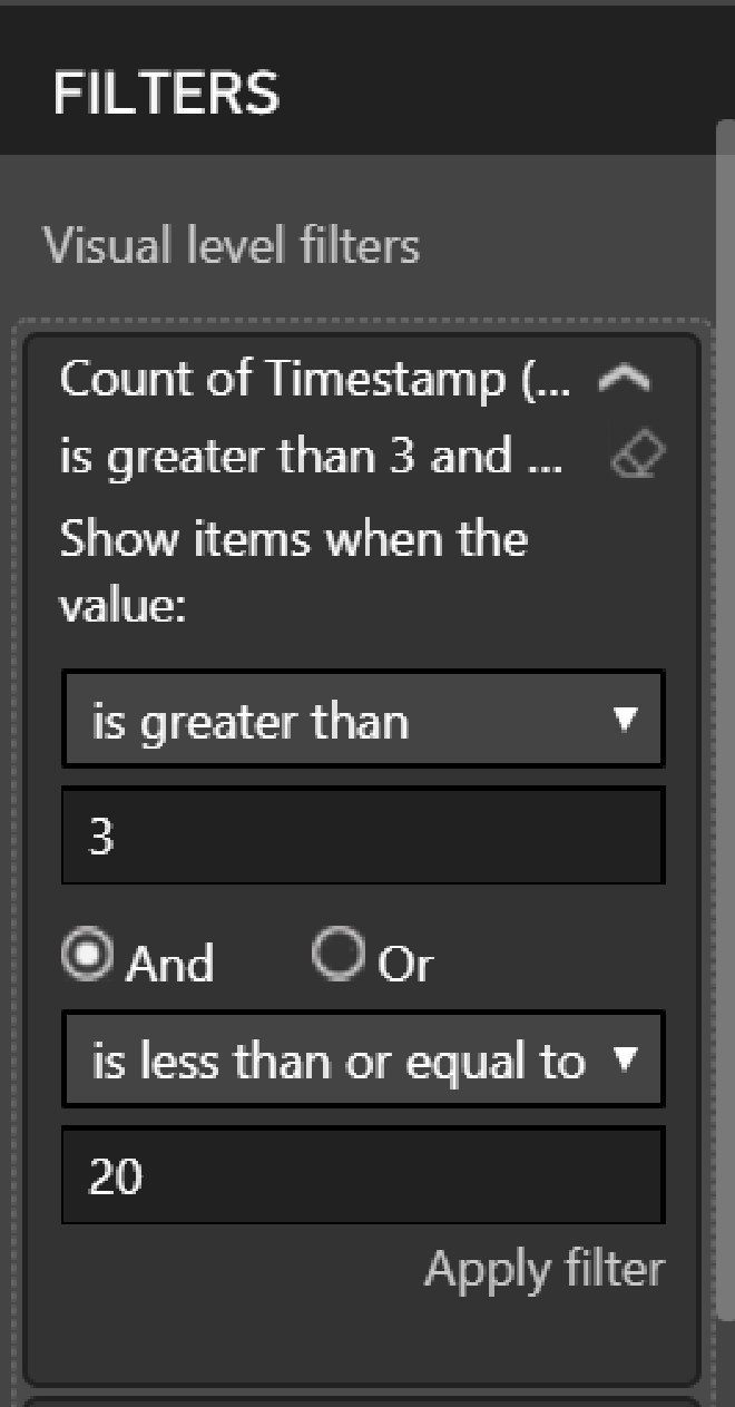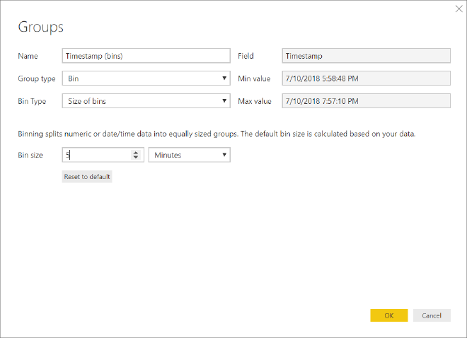 In Power BI we can define the Bin size to put values into equally sized groups. That sounds exactly what we need. Expand the existing query, right-click on the ’timestamp’ field and select New group. This will open the Groups window. Select 5 minutes as the bin size and leave everything else as default.