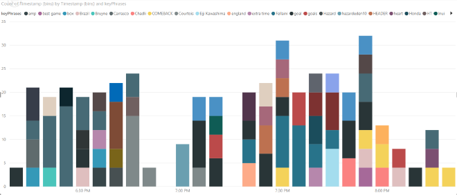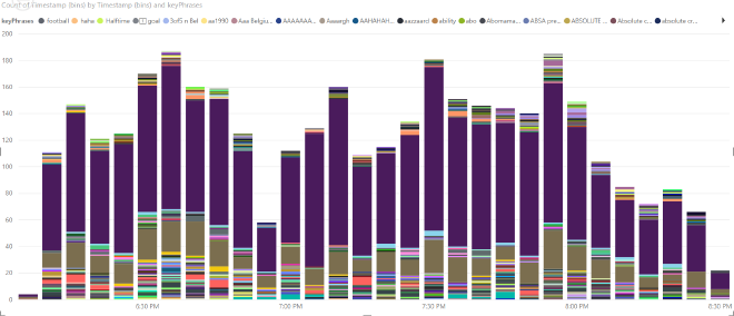 At this stage we have the original tweet or a tweet translated to English. Now we can use Key Phrase Extraction, another capability of the Text Analytics Cognitive Service, to quickly identify the main points of the tweet. We will collect all key phrases from all tweets and analyze which ones occur the most. This will hopefully give us some insights in the main events or key players of the game.
