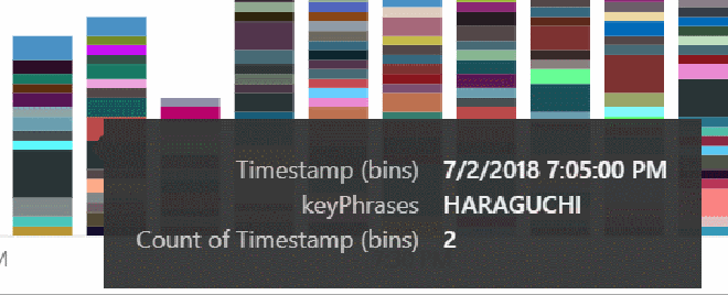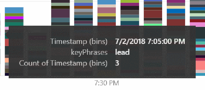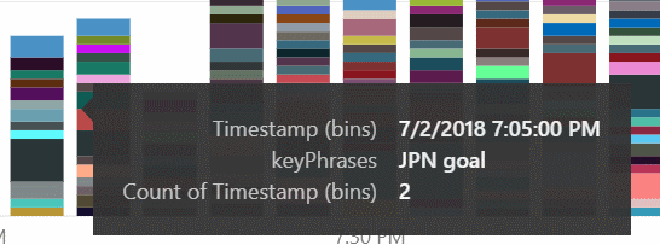 Now let’s add a Stacked column chart. Drag the new ‘Timestamp (bins)’ field to ‘Axis’ and ‘Value’ and the ‘keyphrases’ field to Legend. This will give us a bar for every 5 minutes of the game that contains all the key phrases (and the count) found in that period.