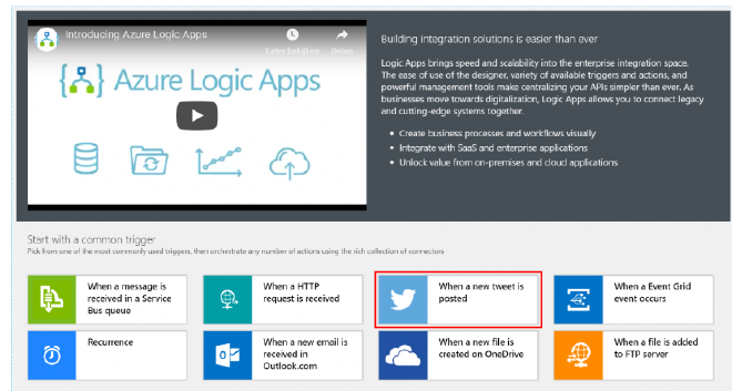 Open the Logic App and click on the Logic App Designer to start configuring the workflow. Select When a new tweet is posted from the list of common triggers to get started.