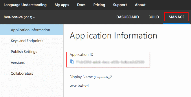 The last step is to create a LUIS project and add it as another service to the Bot. Depending on where you are located visit eu.luis.ai (Europe), au.luis.ai (Australia) or www.luis.ai to create a new LUIS project. After you created a new project navigate to Manage and make a note of the Application ID.