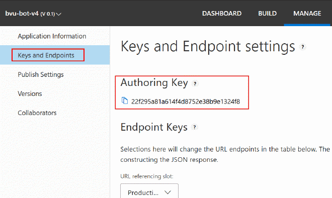 We also need a key to be able to call the LUIS API from our Bot. For now we will use the starter key that is provided for free but we will change to our own key later after we have provisioned our LUIS Cognitive Service in Azure. Navigate to Keys and Endpoint (under Manage) and make a note of the Authoring Key
