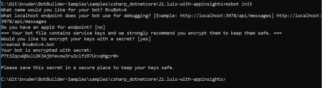 You will be prompted to name your Bot and provide an endpoint. I choose ‘BvuBotv4’ and accepted the defaults for all other questions. This will give you the following response: