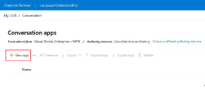 Go to the LUIS portal (for Europe: http://eu.luis.ai) and select the newly created resource as Authoring resource on the Conversation apps screen. Then click on New app to create a new LUIS conversation app and its first version (default v0.1).