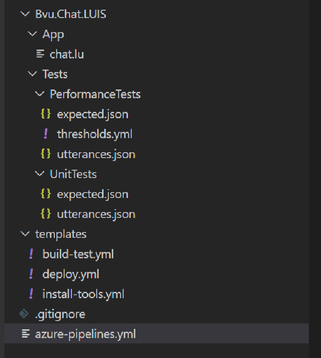 We place the LU file, the export of a version of the LUIS app that we got from the authors, in the App folder. Multiple versions of a LUIS app can be created and exported as a lu or as a json file. In the pipeline we assume that a LU file with the name chat.lu is available.