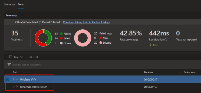 Now we publish the results of the unit and performance tests to make them available in the build summary under Tests and coverage